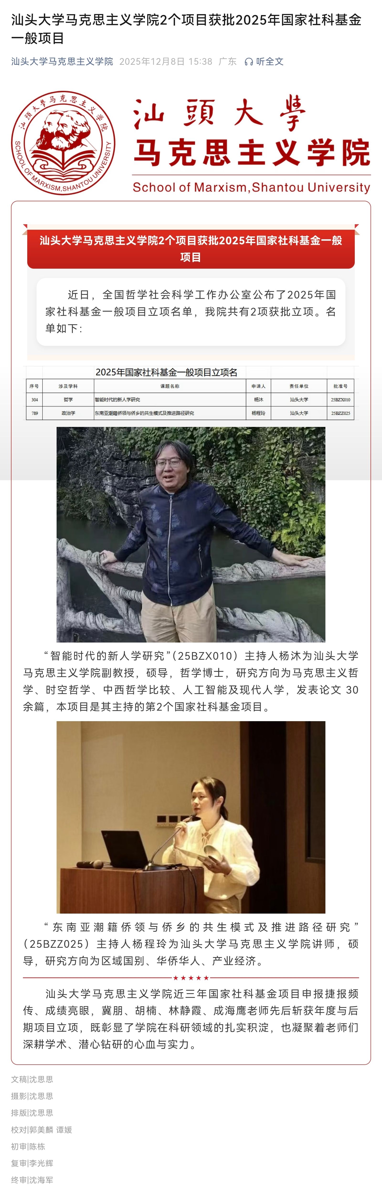汕头大学马克思主义学院2个项目获批2025年国家社科基金一般项目